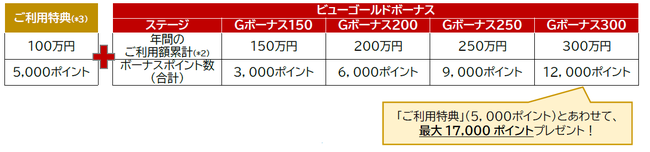 (*2)「ビューゴールドボーナス」は4月〜翌年3月にお届けするご利用代金明細書(3月〜翌年2月末までのご利用分)のご利用額累計