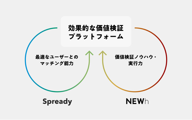 こうした背景から、Spready社とNEWhの強みを掛け合わせ、課題仮説検証、ソリューション仮説検証、体験仮説検証など価値検証タイミングにおいて「最適ユーザーとのマッチング力」と「効果的な価値検証のノウハウ・実行力」を組み合わせることで、スピーディーでより確かな検証を可能にします。
