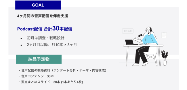 本サービスは合計4ヶ月の期間で計30本の音声配信を行います。最初の1ヶ月は調査、2ヶ月目から収録・配信開始です。伴走支援で作成する戦略資料、要点まとめスライドなどのアウトプットもそのままご提供します。
