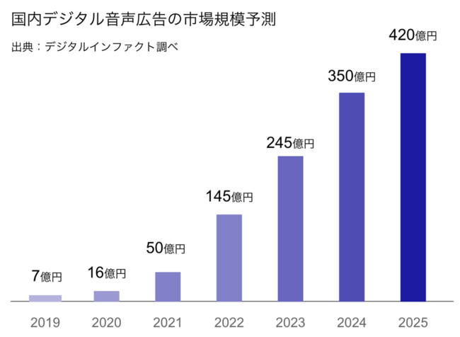 音声市場は以前にも増して注目を集めており、これらの傾向は今後さらに拡大していくことが予測されています。2020年2〜3月にデジタルインファクトによって行われた調査によると、国内の音声広告市場は2020年で16億円規模だったものが、2025年には420億円と急速な成長が見込まれています。