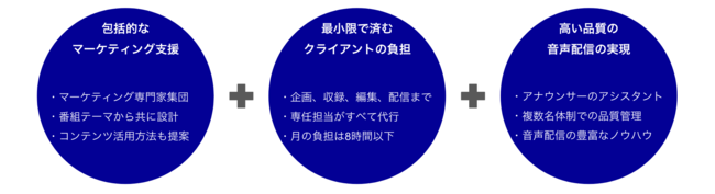 「音声配信支援サービス」は音声配信をゼロイチから立ち上げることを目的とした、オンボーディングサービスです。音声配信は人柄やスタンスを伝えやすいことから求職者へのブランディングや「ラポール形成(顧客と担当者の信頼醸成)」に役立ち、採用活動や集客の手段として認知されつつあります。