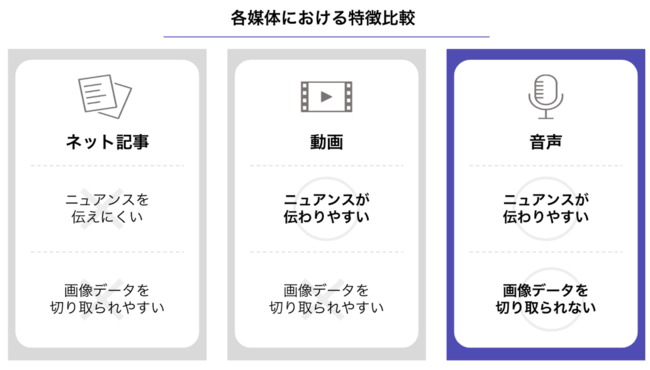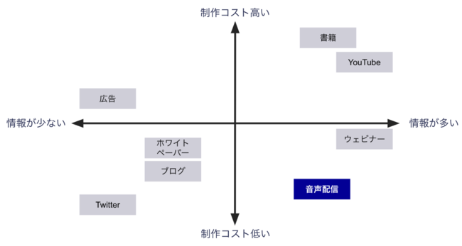 また、音声配信は採用・営業などにおいて、他の代替手段と比較し幾つかの強みを持ち合わせています。一つは「情報量が多く、制作コストが低い」点です。テキストではなく音による情報伝達のため、単純な情報のみならず細かなニュアンスをもって伝えることが可能となります。さらに、動画と比較して収録や編集作業が低い点も大きな利点と言えます。
