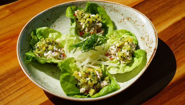 レタスをカップにして豆腐、玉ねぎ、キュウリ、にんじん、コリアンダー、ミントを入れたサラダ
