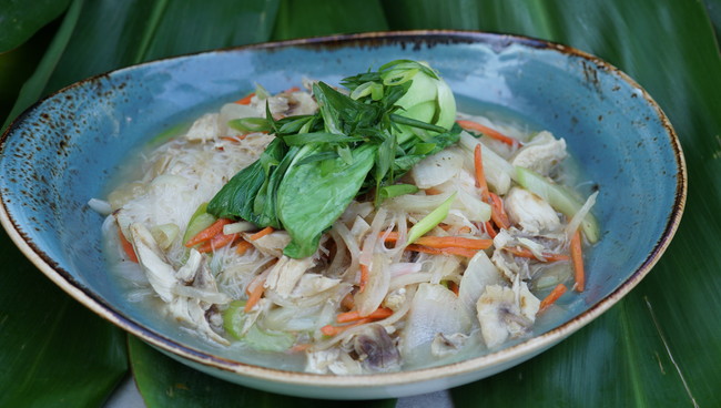 骨なし鶏肉、チンゲン菜、グリーンパパイヤ、玉ねぎ、にんじん、しいたけ、ロミサーモン、ポイ、生姜入りの春雨