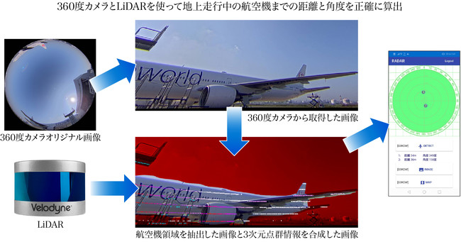 空港内の地上走行中の航空機を対象として、LiDAR※1と360°光学カメラを組み合わせてデータを取得し、クラウド上で稼働中の学習済みAIモデルを使って航空機を検出、対象までの距離・角度を正確に算出する。結果はリアルタイムで実施者のスマートフォンの画面に表示される。航空機は認識率 96.7% で認識され、100m以内の航空機において算出された距離と実測値との誤差の平均は15%であった。これは100mの距離を85mから115mまでの値で測定したことを意味する。