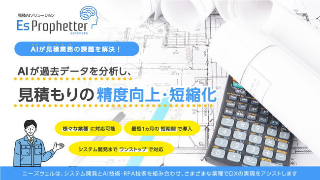 株式会社ニーズウェル(本社:東京都千代田区、代表取締役社長 船津浩三)は、過去の見積実績データを機械学習し、一定水準の見積を即時に算出するAIソリューション「Es Prophetter」(イーエス・プロフェッター)を開発し、2022年4月1日より提供を開始することといたしました。