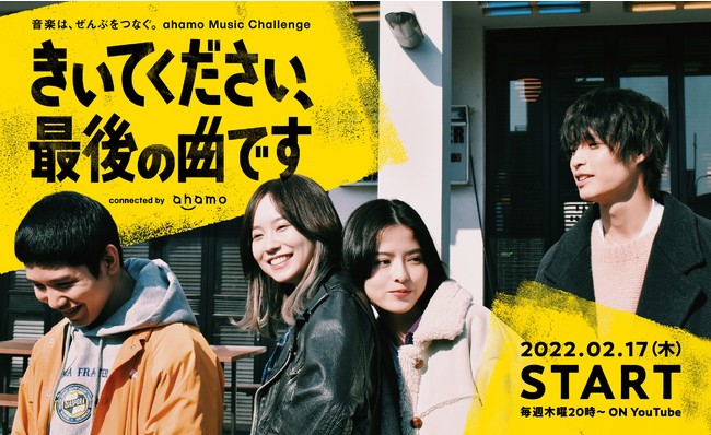 株式会社NTTドコモ(以下、ドコモ)が展開するデジタルネイティブ世代にフィットした料金プラン「ahamo」は、「音楽は、ぜんぶをつなぐ。」をスローガンにした『ahamo music challenge』の第2弾として、4つの視点で描かれる多視点青春ドラマ『きいてください、最後の曲です connected by ahamo (以下、きいてください、最後の曲です)』を制作。2月17日(木)より、毎週木曜20時にahamo公式YouTubeチャンネルで配信いたします。そして、ドラマ公開に先立ち、本日2月10日(木)より、予告編映像を公開いたします。