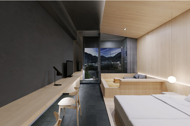 新設客室は「温泉半露天風呂付客室」とすることで、悪天候を気にせずに窓から春来川(はるきがわ)を眺めながら入浴できるようにしました。