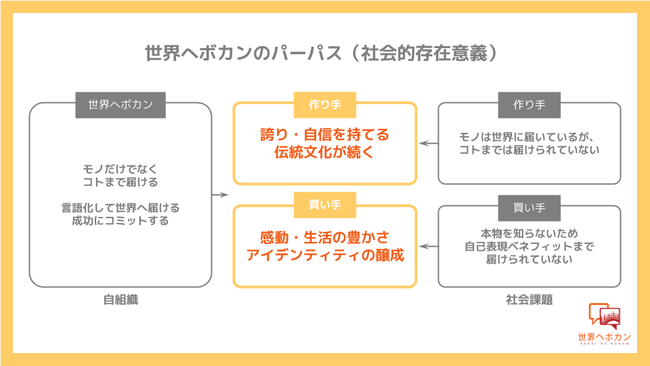 そのようなケースを減らすためにも、世界へボカンは「日本企業の成長を目指し、日本の魅力をモノ・コト双方の側面から届ける」ことに力を注いでまいります。またそれこそが、当社のパーパス(社会的意義)であると考えています。