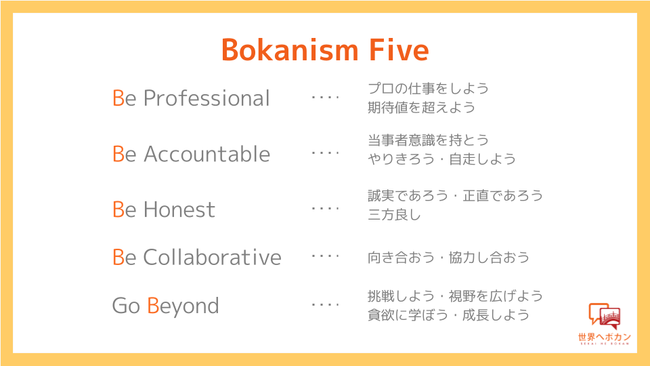 当社がメンバーの育成や日々の業務へ取り組む姿勢として大切にしている5つの考えを「Bokanism Five(ボカニズムファイブ)」として定義づけました。
