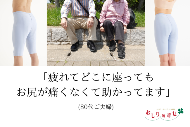 高齢や病気のため痩せてしまった方、痩せ体型の方、お尻の筋肉や脂肪が少ない方の中には、硬い椅子に座るとお尻が痛く悩む方がいます。それが原因で外出を避けるようになったり、外出先の硬い椅子に我慢して座ったりなど、生活の質を落としていることがあります。折りたためるクッションを持ち歩く方もいますが、荷物にもなり、敷くのも恥ずかしい。そんな悩みを解決し「履きはじめて、外に出るのが楽しくなった!」というお声を聞きたいため開発したのが、パッド入りスパッツ「おしりの幸せ」です。