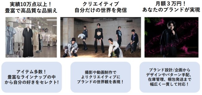 新規ブランドの立ち上げ、生産、商品撮影、販売、発送まで、一貫したサービスを月額3万円にて実現。