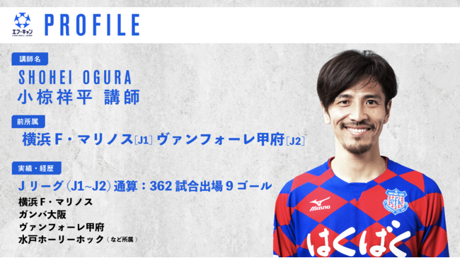 「小椋祥平です!オンラインでサッカーを教わるっていうことが、中々イメージできないかもしれませんが、オンラインだから伝えられることもたくさんあると思います。特に色々なプロ選手のサッカーに対する向き合い方、考え方を聞けるのはとても価値のあることだと思うので、そういったことも含めて子供たちに僕の経験や知識をたくさん伝えられたと思います!技術だけではなくサッカー脳も鍛えましょう!エフ・キャンで待ってます!!」