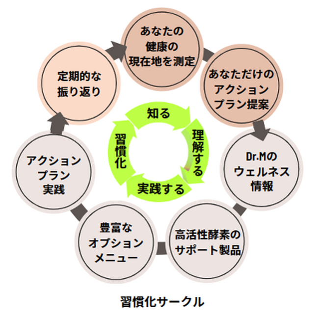 科学的根拠に基づいた情報、パーソナライズド コーチング、高品質の酵素・植物栄養素を利用し、「知る⇒理解する⇒実践する⇒習慣化」の習慣化サークルを回すことで、ウェルビーイングを実現します。