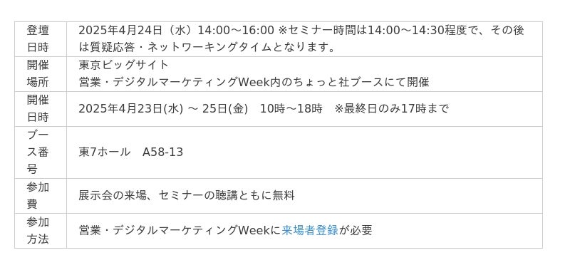 2025年4月23日(水)〜25日(金)に東京ビッグサイトで行われる「営業・デジタルマーケティングWeek」内のブースにて無料で聴講いただけます。