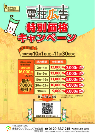 2023年10月1日より電柱広告の製作費が大幅に割引となる「特別価格キャンペーン」を実施いたします。期間中に電柱広告をお申込みいただいた場合、製作費が最大7,000円の割引となります。