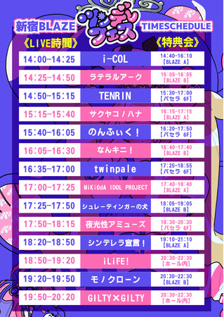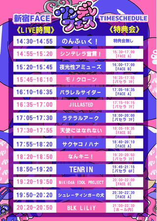 公演名:ツンデレフェス Vol.1 〜新宿テディベアー パレード〜 supported by Amilige 出演:シンデレラ宣言!/ シュレーディンガーの犬 / ラテラルアーク / モノクローン / GILTY × GILTY / iLiFE! / 夜光性アミューズ / のんふぃく!/ twinpale / i-COL / TENRIN / パラレルサイダー / 天使にはなれない / BLK LiLiY / JILLASTED / MiKiOdA IDOL PROJECT / サクヤコノハナ / なんキニ!