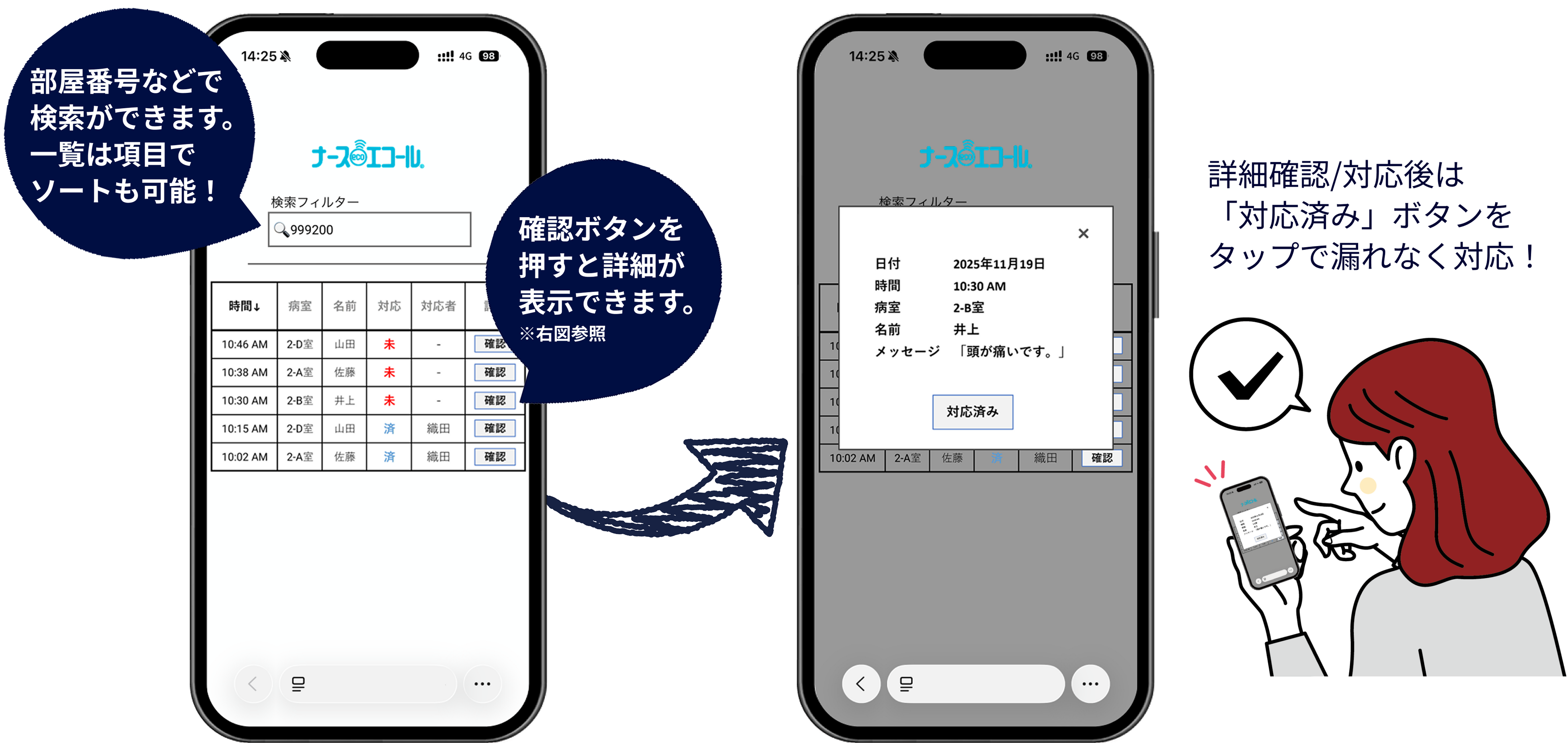専用WEBアプリからは部屋番号などで検索が可能、対応者や対応済みかどうかも一覧上ですぐに把握できます。対応済みのチェックも1アクションで記録できるため、漏れなく対応・確認を行うことができます。