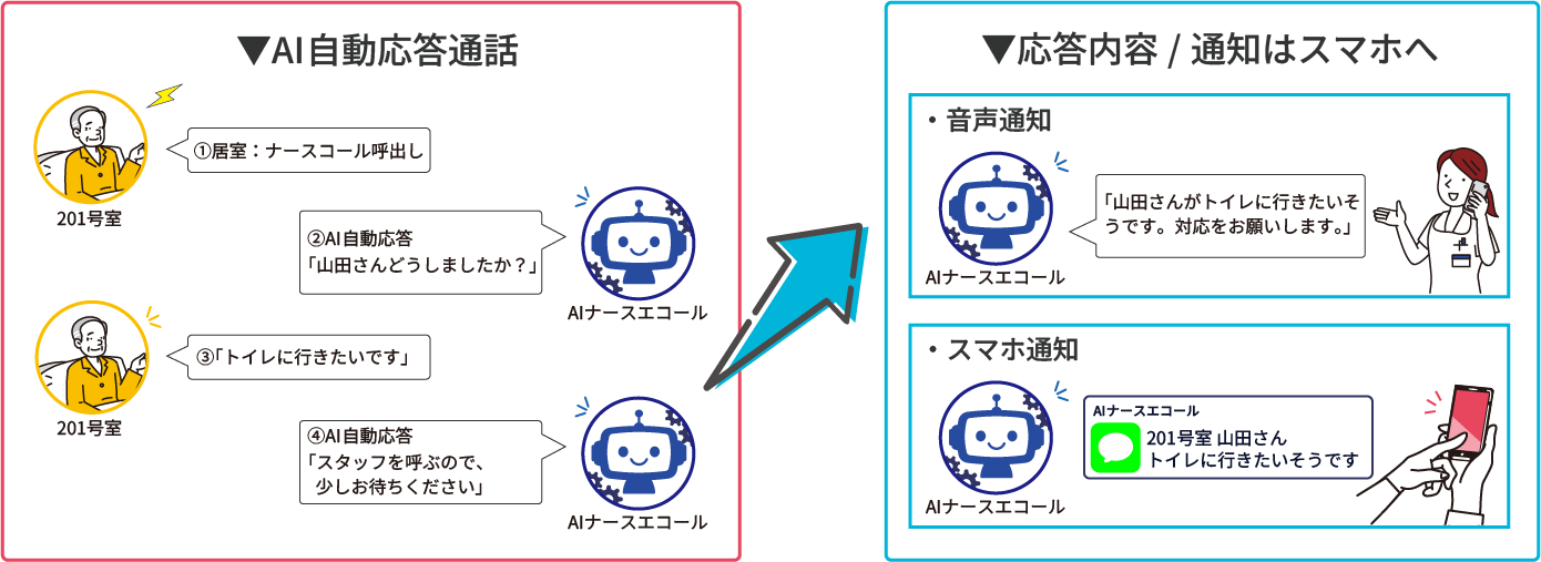 居室からの呼出しをAIナースエコールが自動応答、会話内容は要約されスタッフに通知されます。
