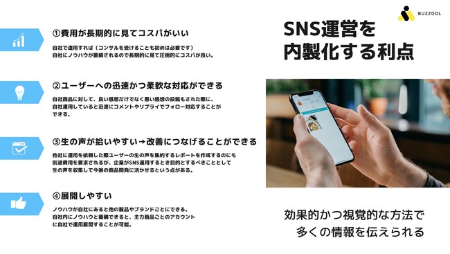 そうした流れから、今後は企業もビジネス領域でのSNS発信が重要となり、自社のSNSアカウントがホームページやLPの代わりになる時代の中で、自社でのアカウント運営に対してBuzzoolは最大限のお手伝いをさせて頂きます。