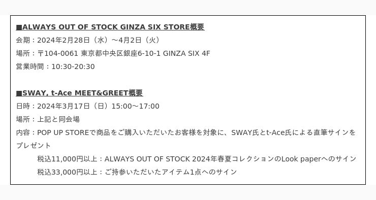 さらに、3月17日(日)にはSWAY氏とt-Ace氏が来場し“MEET&GREET”イベントを開催。本会場及びALWAYS OUT OF STOCK Online Store(http://alwaysoutofstock.com/)にて2024年春夏コレクションの商品をご購入いただいたお客様に、同氏2名による直筆サインをプレゼントします(本イベントは、2024年春夏コレクションの商品ご購入時にお渡しさせていただく整理券をお持ちの方のみご参加いただけます。整理券は数に限りがございますので、予めご了承ください)。2024年春夏コレクションの全LOOK及びイベント詳細は、ALWAYS OUT OF STOCK Official Instagram(https://www.instagram.com/alwaysoutofstock)及びBlog(http://alwaysoutofstock.com/)にてご確認ください。