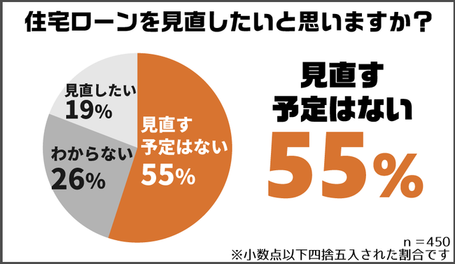 「見直す予定はない」を選択した人が半数以上という結果になりました。大半の人は現在の返済状況や、金利などにとくに不満を持っていないことがわかります。