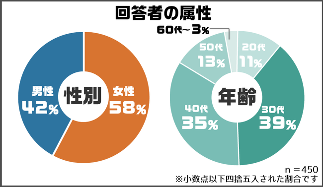 今回アンケートにご協力いただいた450人の、年齢や性別の割合は以下の通りです。