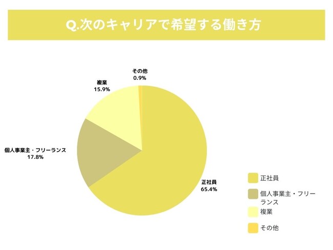 「Q.次のキャリアで希望する働き方を教えてください。」と伺ったところ、正社員が65.4%、その次がフリーランス17.8%、複業15.9%の回答でした。組織を固定しない、自由な働き方を希望する人たちが増えていることがわかりました。