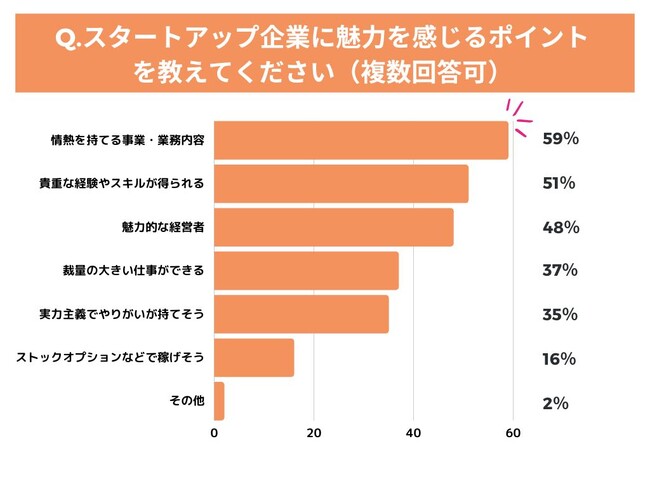 「Q.スタートアップ企業に魅力を感じるポイントを教えてください。(複数回答可)」と伺ったところ、約半数が「情熱を持てる事業・業務内容」「貴重な経験やスキルが得られる」「魅力的な経営者」と回答しました。