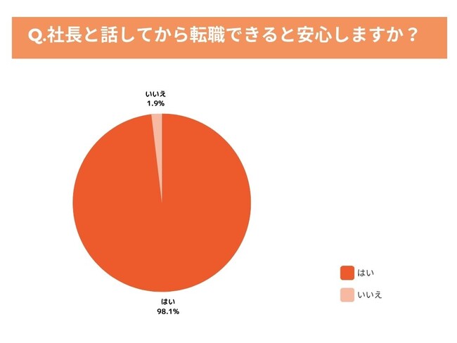 「Q.実際に社長(事業責任者)と話して、雰囲気や人柄に触れてから転職を検討できると安心しますか?」と伺ったところ、98.1%以上の人が安心すると回答しました。