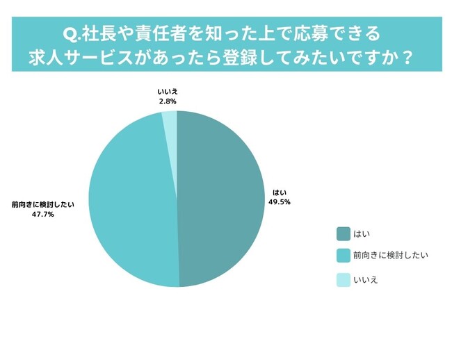 また、「Q.社長(事業責任者)の人柄や仕事観を深く知った上で応募できる求人サイトがあれば、登録してみたいと思いますか?」と伺ったところ、97.2%の人が前向きな回答をしました。