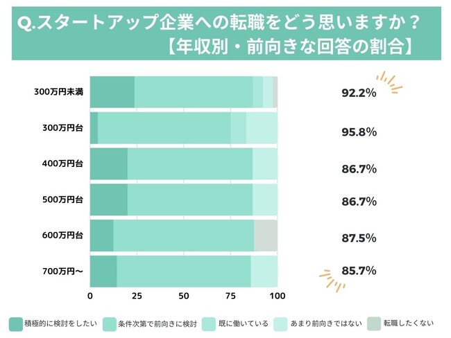 どの年収帯で分析しても、85%以上がスタートアップへの転職を前向きに検討