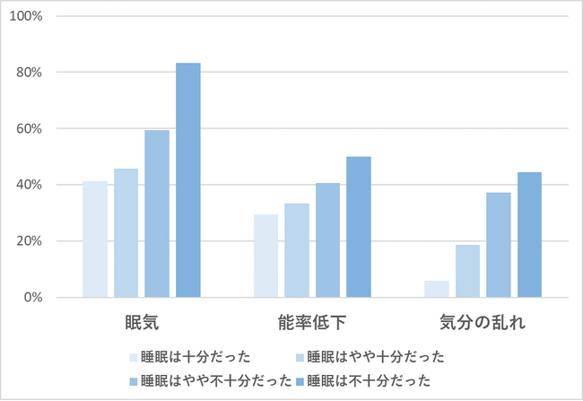 どの症状も睡眠に対する不十分さが強くなるほど頻度が高くなります。特に「気分の乱れ」の頻度は睡眠が十分であるかによる差が大きく、なおかつ対人トラブル等の原因となることも懸念される症状のため注意が必要です。