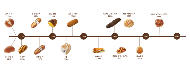 チョコッペを含む様々な定番アイテムの「生まれた年」を長年勤続している社員への聞き取りなどを通じて調査したところ「ミルティー」「フレッシュ」「ドイツ」などはチョコッペよりもさらに古くから作り続けられてきたことが判明しました。年表に載せているのは全て、数十年に渡ってずっと作り続けられ、現在でも販売されている”長寿パン”です。