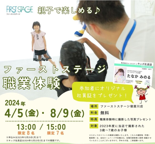 2023年にファーストステージで撮影をされた3歳から7歳のお子さまが対象で、職業体験イベントに参加していただいたお子さま全員に「ファーストステージ キッズ社員証」を贈呈いたします。