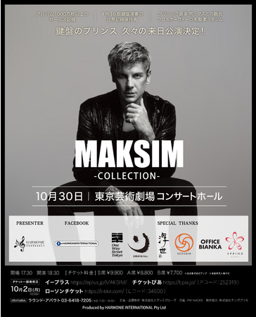MTVミュージック・アワードや名誉ある国際音楽コンクールで上位入賞を果たしている名ピアニストMAKSIMは、コールドプレイ、ジョン・レジェンド、クイーンの大ヒット曲、『ゴッドファーザー』、『パイレーツ・オブ・カリビアン』、『ゲーム・オブ・スローンズ』などの映画のテーマ曲、リストやショパンのクラシックの名曲、そして「熊蜂の飛行」、「栄光への脱出」など、過去10枚のアルバムの名作を演奏する予定。