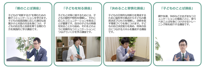 「親のことば講座」「子どもを知る講座」「決めること習慣化講座」「子どものことば講座」