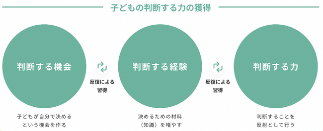本アカデミーでは、テクノロジーの発展によって子どもたちを取り巻く環境が変化し、子どもが子ども自身で判断しなければいけない場面の低年齢化に着目し「会話を通して子どもの“判断する力”を育む」を理念として定めています。また、「対等なコミュニケーション」、「知識さを埋める」、「子ども自身による判断」を上記理念に基づいた習慣とするべき3つの要素として掲げ、習得に必要な独自的且つ専門的なカリキュラムをご用意しています。