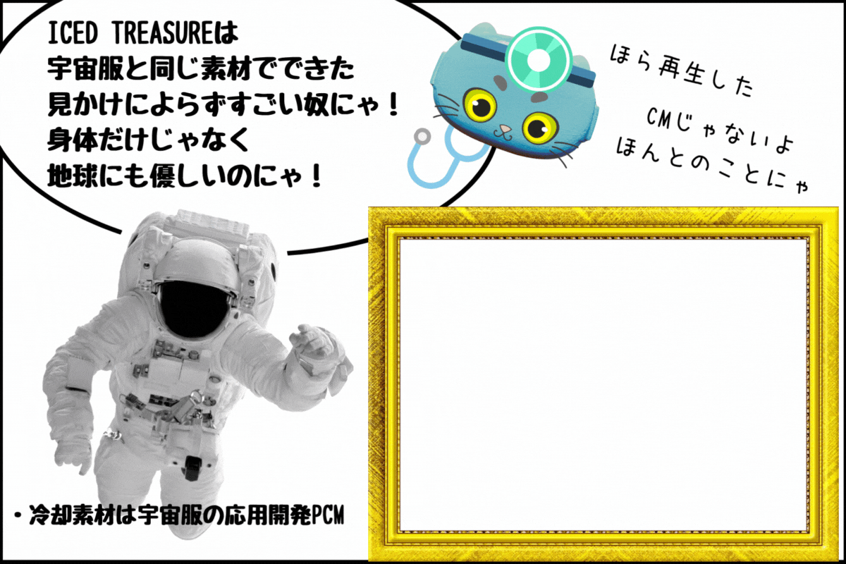 宇宙空間の気温は、太陽との位置関係などにより、-150℃〜120℃ほどになります。その過酷な状況の中での作業を可能にするため、宇宙服には一定の温度を長く保つことができる潜熱蓄熱材(PCM)が使われています。ICED TREASUREが体温で温められても快適な温度が続くのは、これと同素材を使用しているからです。