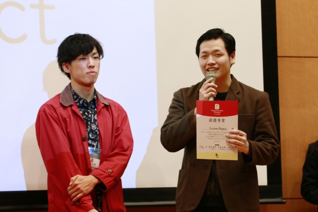 優勝チームのプレゼンターの角田大河さんは、「広島の地からも若者がイノベーションを起こそうとがんばっていることを伝えたい。」と喜びのコメント。審査委員長の株式会社博報堂ブランドイノベーションデザイン局局長の宮澤正憲氏からは「どのチームも自分の身近な課題から素晴らしいアイデアを発想し、我々をびっくりさせてくれました。これで終わりにするのではなく、情熱をもって一歩踏み出し、イノベーションを起こしてほしい!」と称賛と激励のコメントが送られました。