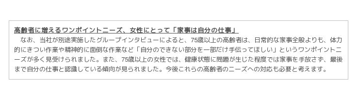 当社は、今回の意識調査によって分かった「家事代行サービスへの抵抗感や不安感」を軽減するための情報発信・ご提案をすることで、便利な商品やサービスなどを上手に取り入れ、時に誰かの手を借りることで生まれる、心のゆとりと元気な暮らしを応援します。