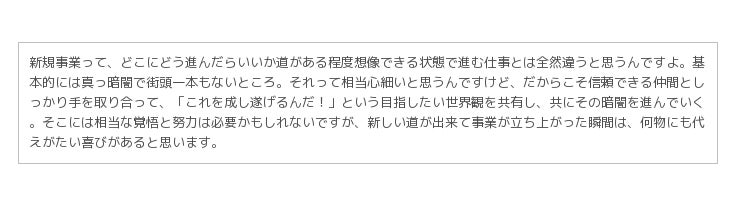 しかし、新規事業の創造とは「正解がない仕事」だからこそ、得てして、孤独で、常に不安と苦悩、焦燥感がつきまとうもの。そんな数々の苦悩によって、心に灯った火が消えないように。寄り添い、新しい気づきを与え、同志がいることを伝える、全ての経営者と社内起業家を応援するための場所として「incubation inside」を立ち上げました。この場を通して、日々チャレンジを続ける皆さまの一助になれれば幸いです。