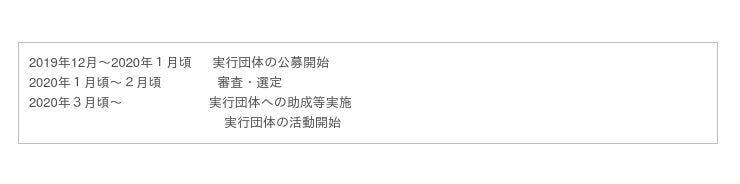 今後、各資金分配団体は、以下のような日程で、実行団体の公募、審査、選定を行い、実行団体が今年度中に活動を開始する見込みです。