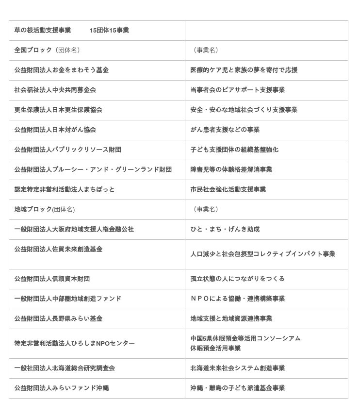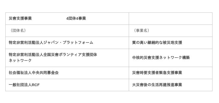 なお、実行団体の公募の状況については、各団体のウェブサイトのほか、JANPIAのウェブサイトに掲載し、随時更新します。