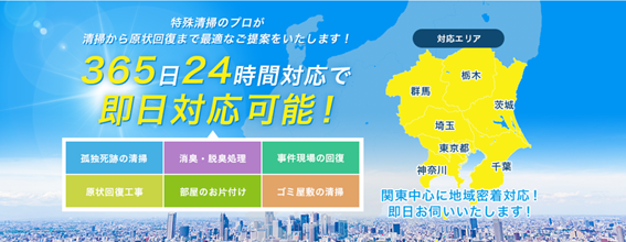 特殊清掃を専門業務として施工している企業です。提供しているサービスは特殊清掃以外にお片付け(遺品整理・住環境改善・残置物撤去)があり不動産会社・葬儀社・公共関連施設の業務提携や取引先数は100社以上に及びます。業界では珍しい「完全透明化企業」として料金体系・現場実績・評判を誰にでも分かりやすくWEB上で開示しており、地方自治体や財閥系老舗企業からのお仕事も請け負っています。また、運営しているYoutubeチャンネル【特殊清掃チャンネル(二代目すーさんTV)】(https://www.youtube.com/channel/UCpy7KGyObK0mLzArY8-BveA/)では約三万人の登録者に対して特殊清掃や遺品整理の有益な情報を発信しており、メディア実績も多数あり。