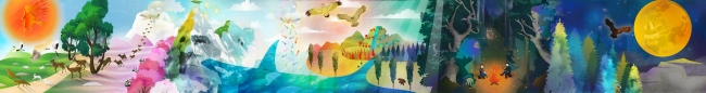 動物や自然,そして,決して人間の力がおよばないあらゆる現象をアイヌの人々は「カムイ(=神)」と呼びます。カムイの宿った北海道の大自然を一枚の大きな絵(アニメーション)で描き,異国の地から訪れたお客様への歓迎の意を込め,アイヌがどのような民族なのかを表現しています。