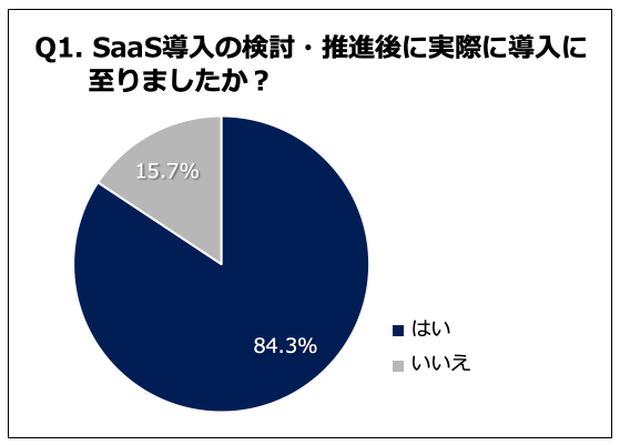 はじめに「Q1.SaaS導入の検討・推進後に実際に導入に至りましたか?」(n=108)と質問したところ、「はい」が84.3%とほとんどの人が導入したことがわかりました。