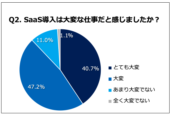 次に、Q1で『はい』と回答した人に、「Q2.SaaS導入は大変な仕事だと感じましたか?」(n=91)と質問したところ、「とても 大変」「大変」と答えた人が87.9%と半数以上の経験者が「大変」と感じていたことが判明しました。