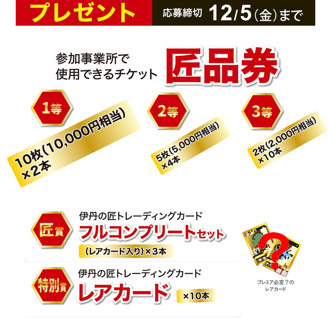 今回ご参加いただいている全事業所で使用できるチケット『 匠品券(しょうひんけん) 』や、達成特典限定の幻の『レアカード』などを抽選でプレゼント。 レアカードの正体は、当選した人にしかわかりません!