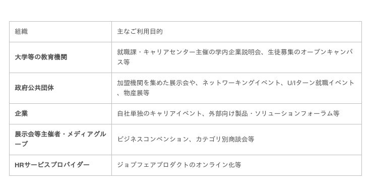 このサービスをご利用いただくことで、例えば、各大学が学生のキャリア支援のために開催している学内就職説明会においては、 物理的な接触を必要としない環境下でも、潜在的な求職者がより良い求職活動を経験できる場を構築しながら、企業側には優秀な人財を見つけ出してもらうことが可能です。 またEASYバーチャル・フェアは、 フルカスタマイズ可能なプラットフォームであるため、 ジョブフェアのみならず、教育機関による生徒募集のためのオープンキャンパスや、 各種展示会・ビジネスコンベンションにも数多くご利用いただいています。